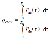 轉(zhuǎn)換效率是指在規(guī)定的測(cè)試周期TM內(nèi),光伏逆變器在交流端口輸出的電能與在直流端口輸入的電能的比值,計(jì)算公式如下所示: