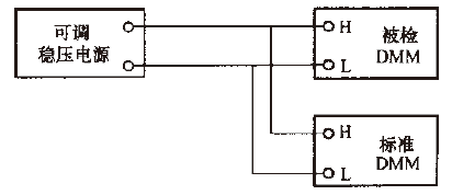 直接比較法如圖3所示。一般情況下標準數(shù)字電壓表的位數(shù)應比被檢表多一位。輸出電壓源要考慮其穩(wěn)定度、調(diào)節(jié)細度與紋波等技術(shù)指標。一般來說穩(wěn)定度應小于被檢表允許誤差1/5~1/10,調(diào)節(jié)細度應小于被檢表允許誤差的1/10。紋波的影響應不引起標準表和被檢表的跳字。對于標準表應保證其準確可靠,為此必須對標準表進行定期的檢定和校準。標準表的誤差可以按分時段指標來考慮。