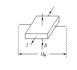 在半導(dǎo)體薄片兩端通以控制電流I,并在薄片的垂直方向施加磁感應(yīng)強(qiáng)度為B的勻強(qiáng)磁場,則在垂直于電流和磁場的方向上,將產(chǎn)生電勢差為UH的霍爾電壓。