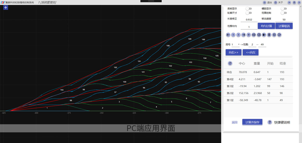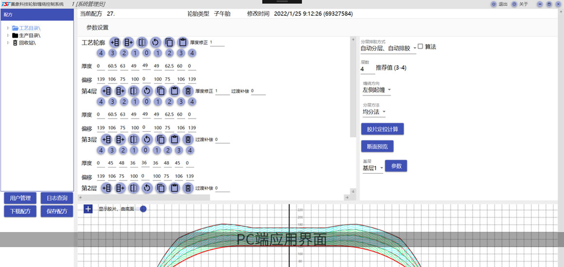 此系統(tǒng)利用非線性數(shù)學(xué)模型線性化的方法,將不規(guī)則的胎面形狀轉(zhuǎn)化成線性圖形,并通過(guò)預(yù)覽圖直觀的顯示設(shè)計(jì)結(jié)果,提供多種編輯方式,以便用戶快速調(diào)整達(dá)到預(yù)期效果。此外,系統(tǒng)在多個(gè)項(xiàng)目中積累經(jīng)驗(yàn),成功開(kāi)發(fā)出自動(dòng)分層功能,支持多種分層算法和膠片定位算法,分層結(jié)果科學(xué)精準(zhǔn)。設(shè)計(jì)結(jié)果可一鍵下發(fā)到生產(chǎn)設(shè)備,實(shí)現(xiàn)控制系統(tǒng)與生產(chǎn)制造裝備的數(shù)字化聯(lián)通。
