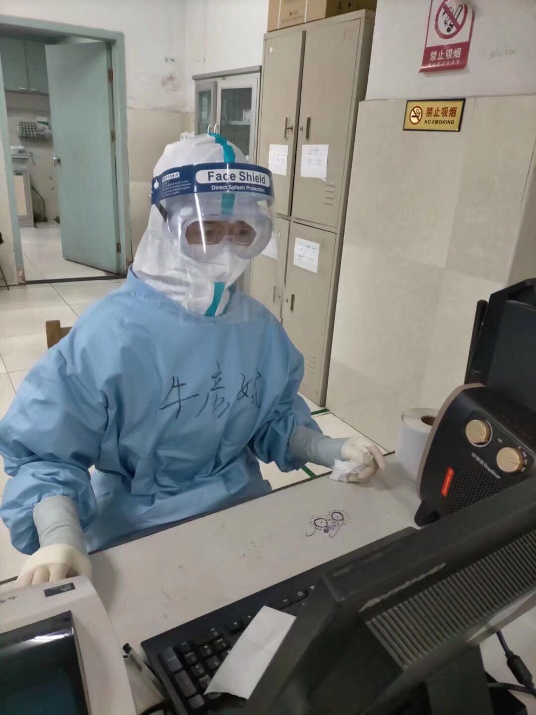 在湖北省武漢市的武鋼二院,牛彥娥在紅區(qū)擔(dān)任醫(yī)療護(hù)理工作,至今已連續(xù)在前線奮戰(zhàn)一個半月有余。作為一名奮戰(zhàn)在抗疫一線的護(hù)士,她的工作雖然瑣碎卻無一不關(guān)乎著病人的安危,為病人輸液、發(fā)藥、測體溫、測血氧、監(jiān)測生命體征等,繁重的任務(wù)讓她幾乎全周無休,每天要穿著笨重而密不透風(fēng)的防護(hù)服在醫(yī)院紅區(qū)進(jìn)行護(hù)理工作,有時常常還要在深夜值班。往往一天的工作結(jié)束后,她的臉上都會留下深深的壓痕;防護(hù)服下的衣服也常常被汗水浸透。