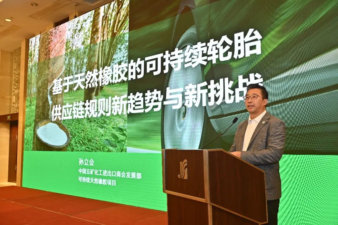 中國(guó)五礦化工進(jìn)出口商會(huì)發(fā)展部主任孫立會(huì)作報(bào)告,題為“基于天然橡膠的可持續(xù)輪胎供應(yīng)鏈規(guī)則新趨勢(shì)與新挑戰(zhàn)”。