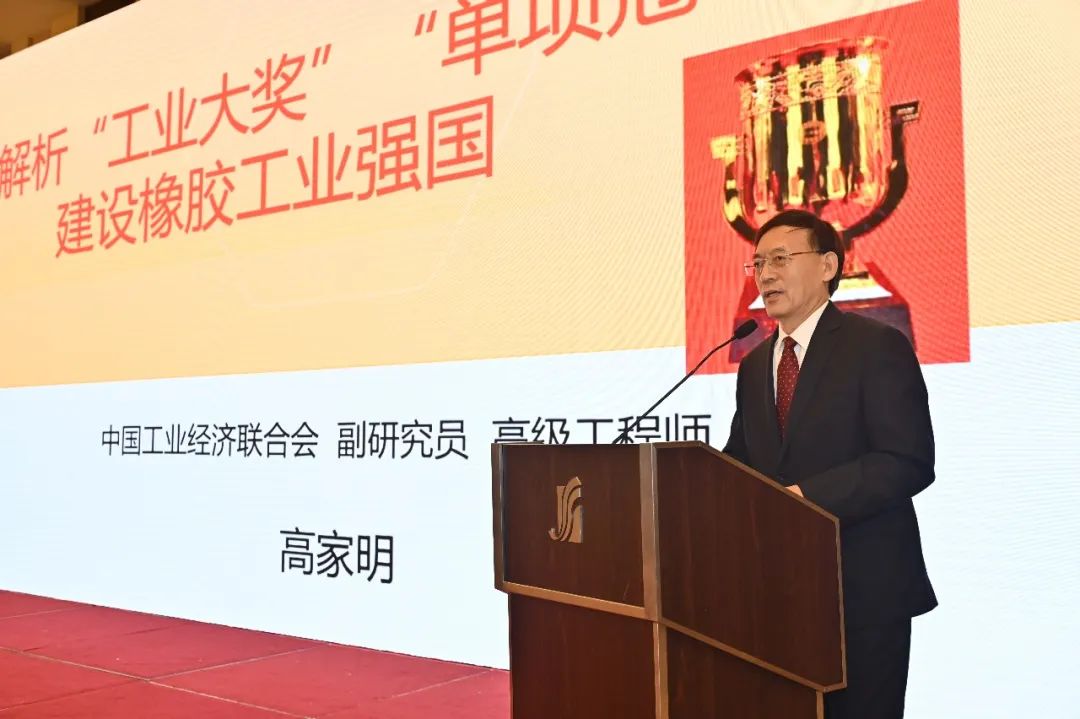 中國(guó)工業(yè)經(jīng)濟(jì)聯(lián)合會(huì)黨委副書記、副研究員、高級(jí)工程師高家明,作“解析‘工業(yè)大獎(jiǎng)’‘單項(xiàng)冠軍’,建設(shè)橡膠工業(yè)強(qiáng)國(guó)”的報(bào)告。高家明曾任首屆“中國(guó)工業(yè)大獎(jiǎng)”組委會(huì)辦公室主任兼評(píng)審委員會(huì)秘書長(zhǎng)、“中國(guó)工業(yè)大獎(jiǎng)”工作委員會(huì)副主任、審定委員會(huì)委員,制造業(yè)“單項(xiàng)冠軍”工作委員會(huì)副主任,組織實(shí)施了兩大獎(jiǎng)項(xiàng)的評(píng)審工作,負(fù)責(zé)起草相關(guān)管理辦法和標(biāo)準(zhǔn)。他從大獎(jiǎng)設(shè)立的淵源到評(píng)審標(biāo)準(zhǔn)、流程,為大家進(jìn)行了詳細(xì)梳理,還列出了橡膠輪胎行業(yè)取得優(yōu)異成績(jī),呼吁企業(yè)更加合規(guī)經(jīng)營(yíng),創(chuàng)造更好的業(yè)績(jī)。
